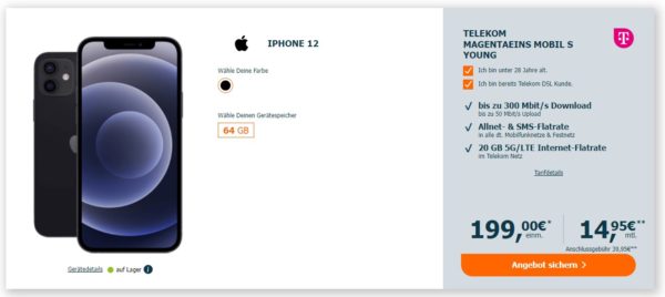 *EFF. 96€ ERSPARNIS* Telekom MagentaEins Young Apple iPhone 12 20GB LTE + Alles-Flat für 14,95€/Monat