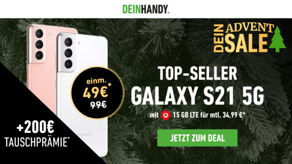 Bei DeinHandy bekommt ihr das Samsung Galaxy S21 5G + 15 GB LTE + Alles-Flat im Vodafone-Netz für 34,99€/Monat
