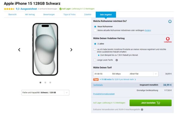 *TARIF EFF. GRATIS* Apple iPhone 15 (128GB) + 35GB LTE/5G + Alles-Flat im VF-Netz für 34,99€/Monat + 200€ Wechselbonus (GigaKombi, Young möglich)
