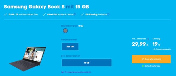 Wie wäre es mit einem Galaxy Book S statt Smartphone? Bei Blau bekommt ihr das Samsung Galaxy Book S (19€) + 15 GB LTE + Alles-Flat im o2-Netz für 29,99€/Monat