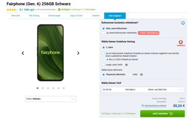Fairphone (Gen. 6) 256GB + 20GB 5G + Alles-Flat im Vodafone-Netz für 29,99€/Monat – eff. 2,36€/Monat