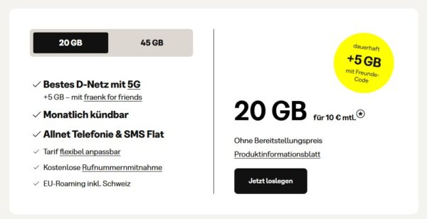 Martin 09.03.2023, 21:57 #Einfach den Code LOSLEGEN bei der Anmeldung verwenden und schon bekommst du statt 7GB dauerhaft 8GB 🙂