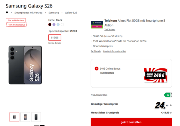 Starker Deal seitens MediaMarkt zum Wochenende, dort bekommt ihr das Samsung Galaxy S26 512GB + 50GB 5G + Alles-Flat im Telekom-Netz für 44,99€/Monat