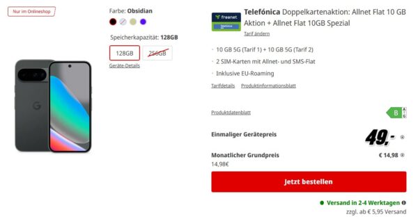 Zum Start in das Wochenende haut MediaMarkt einen richtigen Knaller raus, dort könnt ihr euch das Google Pixel 10 128GB + 2x 10GB 5G + Alles-Flat im o2-Netz für 14,98€/Monat sichern