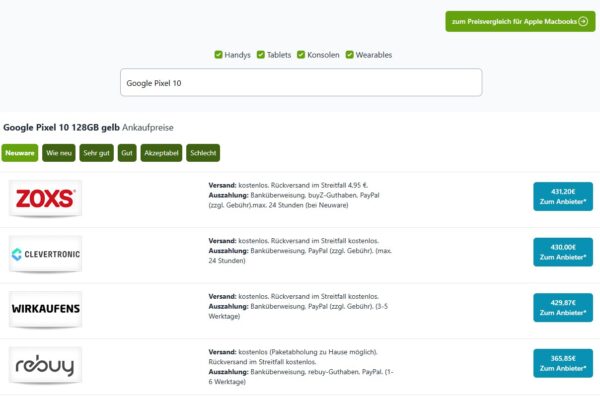 Momentan bieten euch die Ankaufsportale z.B. für die gelbe Version die folgenden Preise (Stand 20.02.2026 – 18:45 Uhr)
