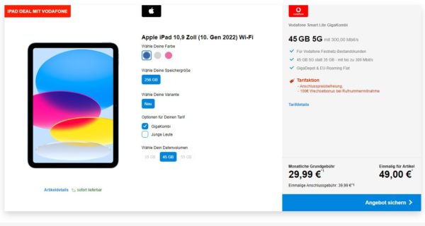 *GigaKombi* Apple iPad 10,9″ Wi-Fi + 45GB LTE + Alles-Flat im Vodafone-Netz für 29,99€/Monat – eff. 2,91€/Monat