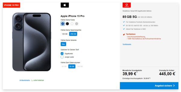 GigaKombi: Apple iPhone 15 Pro (256GB) + 85GB/5G + Alles-Flat im Vodafone-Netz für 39,99€/Monat – eff. 3,99€/Monat