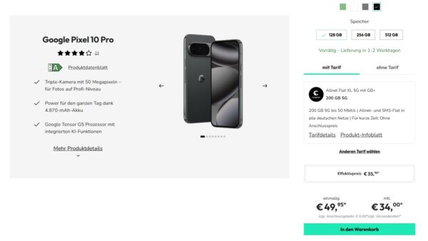 Google Pixel 10 Pro + 200GB 5G + Alles-Flat im Telekom-Netz für 34€/Monat – eff. 4,54€/Monat