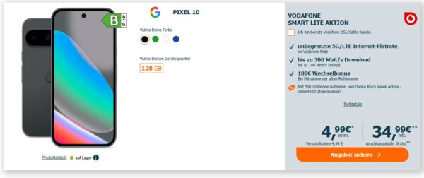 Google Pixel 10 + Unbegrenztes 5G + Alles-Flat im Vodafone-Netz für 34,99€/Monat – eff. 3,49€/Monat