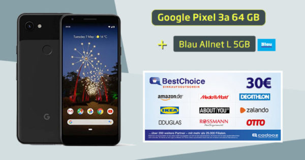 Bei unserem neuen BonusDeal erhaltet ihr das Google Pixel 3a inkl. 5GB LTE Allnet-Flat für 11,99€/Monat + 30€ Bonus in Form eines BestChoice-/Amazon.de Gutschein*. 🙂