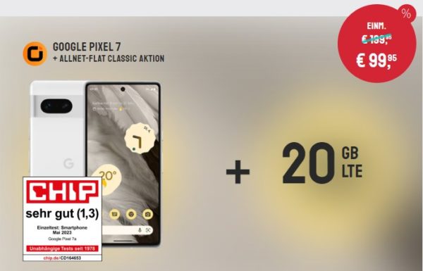 Bei Sparhandy bekommt ihr zum Start in das Wochenende das Google Pixel 7 + 20 GB LTE + Alles-Flat im Vodafone-Netz für 19,99€/Monat
