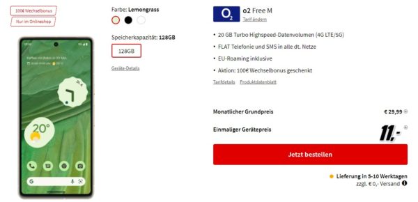 Google Pixel 7 + 20GB LTE + Alles-Flat im o2-Netz für 29,99€/Monat + 100€ Wechselbonus – Eff. 0,91€/Monat
