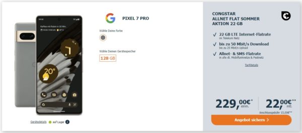 Google Pixel 7 Pro inkl. 22 GB Telekom LTE AllnetFlat für 22€/Monat
