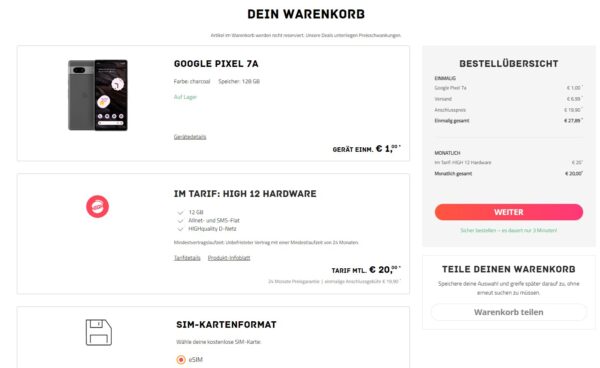 Zum Start in die neue Woche haut HIGH-Mobile ein Bundle mit dem Google Pixel 7a raus, bestehend aus dem Google Pixel 7a 128GB (verschiedene Farben) + 12GB LTE + Alles-Flat im Telekom-Netz für 20€/Monat