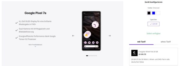 Schönes Angebot von DeinHandy, dort bekommt ihr das Google Pixel 7a + 20GB LTE + Alles-Flat im Telekom-Netz für 22€/Monat