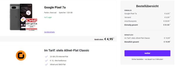 Sehr schönes Angebot von DeinHandy, dort bekommt ihr das Google Pixel 7a + 20GB LTE + Alles-Flat im Vodafone-Netz für 19,99€/Monat