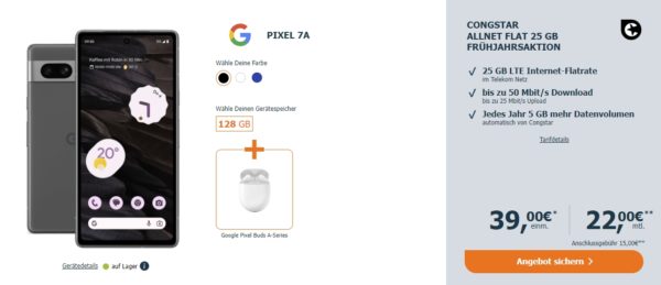Google Pixel 7A + 25GB Congstar LTE AllnetFlat für eff. 5,88€/Monat