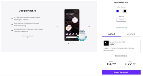 Schönes Bundle von DeinHandy, dort bekommt ihr das Google Pixel 7a + Buds A + 44GB LTE + Alles-Flat im Telekom-Netz für 22€/Monat