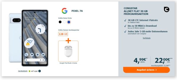 Google Pixel 7A + Google Pixel Buds A + 30GB LTE + Alles-Flat im Telekom-Netz für 22€/Monat – eff. 3,96€/Monat