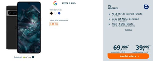 Google Pixel 8 Pro + 70GB LTE/5G + Alles-Flat im o2-Netz für 39,99€/Monat
