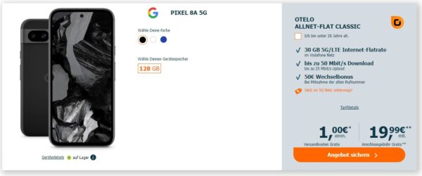 Google Pixel 8A 5G + 30GB LTE/5G + Alles-Flat im VF-Netz für 19,99€/Monat – eff. 0,20€/Monat + 50€ Bonus