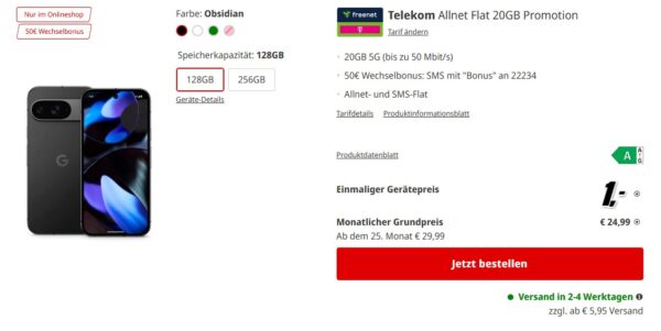 Neuer Deal seitens MediaMarkt, dort könnt ihr euch das Google Pixel 9 + 20GB 5G + Alles-Flat im Telekom-Netz für 24,99€/Monat sichern