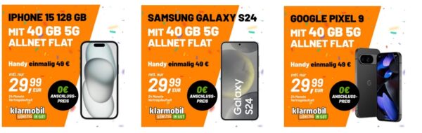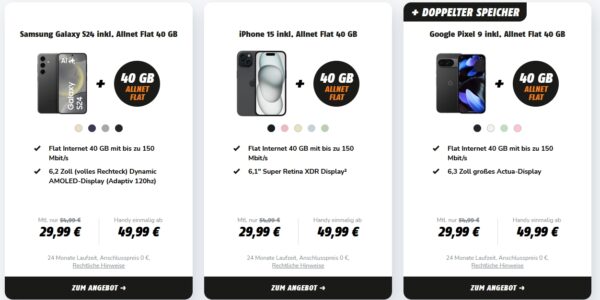- iPhone 15 mit 40GB Allnet-Flat für 29,99€/Monat + 49,99€ Zuzahlung