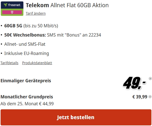 - = Rechnerische Tarifkosten von 154,70€ über 24 Monate = 6,45€/Monat für den reinen Tarif, hättet ihr euch das Gerät sowieso regulär gekauft.