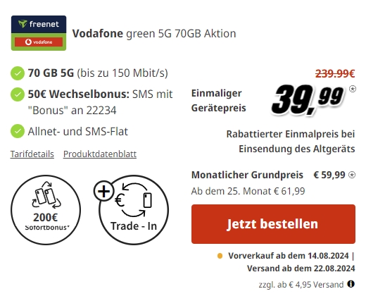 - Surfen: 70 GB 5G/LTE Internet-Flatrate (Mit bis zu 150 MBit/s)