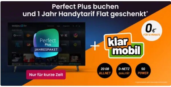 Bei Abschluss eines „Perfect Plus mit klarmobil Jahrespaket“ erhält der Kunde einen Gutschein für 12 Monate 0,- € Grundgebühr für den Tarif klarmobil waipu.tv-Allnet Flat 20 GB im 5G Netz. Den Gutschein-Code erhält der Kunde nach Abschluss des Pakets per E-Mail. In der E-Mail findet sich ein Link, der den Kunden auf eine Bestellseite führt, über den der Kunde nach Code-Eingabe für den Kauf des klarmobil waipu.tv-Allnet Flat 20 GB-Tarifes freigeschaltet wird. Der Gutschein ist bis zum 31. Januar 2026 einlösbar. Vertragspartner für den Tarif klarmobil waipu.tv-Allnet Flat 20GB im 5G Netz ist die klarmobil GmbH, Hollerstraße 126, 24782 Büdelsdorf.