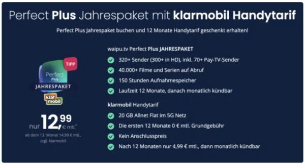 - waipu.tv Perfect Plus + 1 Jahr 20GB-Handytarif geschenkt – nur 12,99€/Monat