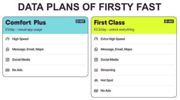 - Firsty First Class für 2,50€/Tag: 5GB/Tag (2GB/Tag in ein paar Ländern), aber dann mit genug Speed zum Weitersurfen