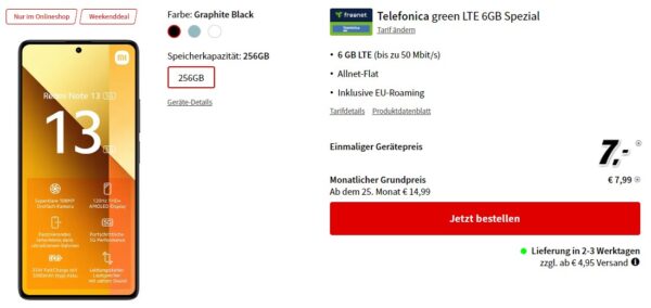 *GÜNSTIGER ALS SIM-ONLY* Xiaomi Redmi Note 13 5G + 6GB LTE + Alles-Flat im o2-Netz für 7,99€/Monat – eff. 1,03€/Monat