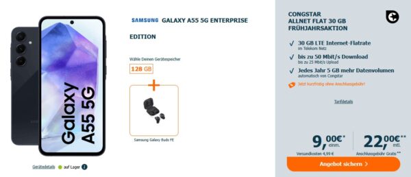 - Congstar Allnet Flat 30 GB mit Samsung A55 Enterprise Edition & Galaxy Buds FE ab 22€/Monat + weitere Vorteile + Zuzahlung