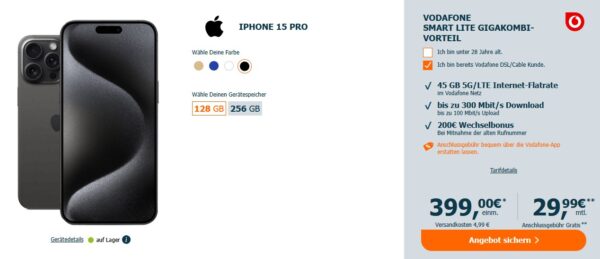 Vodafone Smart Lite (mit und ohne GigaKombi) mit Apple Iphone 15 Pro 128GB / 256GB