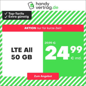 Bei handyvertrag.de, einer Marke der Drillisch AG (Simply & Co.), erhaltet ihr die 50GB LTE Allnet-Flat für 24,99€/Monat (auch ohne Vertragslaufzeit!). 🙂
