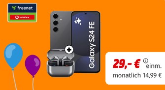 Nice, bei MediaMarkt bekommt ihr das Samsung Galaxy S24 FE+ Galaxy Buds 3 + 10GB LTE + Alles-Flat im VF-Netz für 14,99€/Monat + Zuzahlungen.