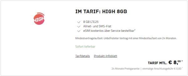 HIGH Mobile 8 GB LTE AllnetFlat für 8€/Monat ohne AP!