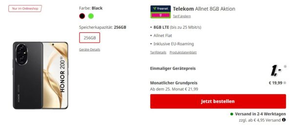 Neues Angebot von MediMarkt, dort bekommt ihr das Honor 200 + 8GB LTE + Telefon-Flat im Telekom-Netz für 19,99€/Monat