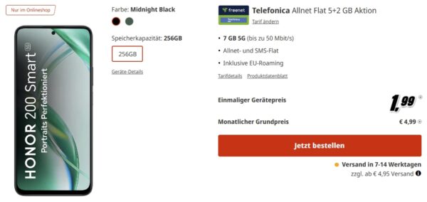 Bei MediaMarkt erhaltet ihr derzeit das Honor 200 Smart für 1,99€ + 7 GB 5G/LTE AllnetFlat für 4,99€/Monat!