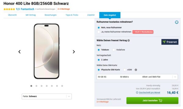 Honor 400 Lite + 50GB 5G + Alles-Flat im Telekom-Netz für 14,99€/Monat – eff. 0,99€/Monat