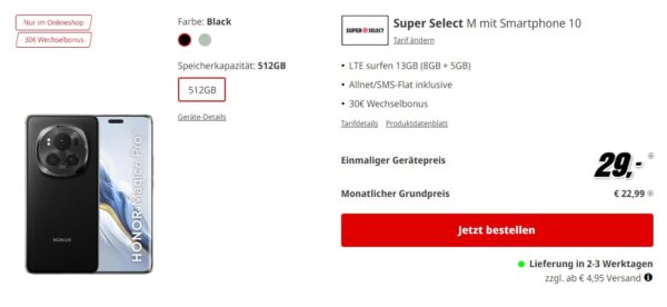 Heute nimmt es kein Ende mit den Angeboten bei MediaMarkt, dort bekommt ihr nun mit effektiv 324€ Ersparnis das Honor Magic 6 Pro 5G + 13GB LTE + Alles-Flat um o2-Netz für 22,99€/Monat