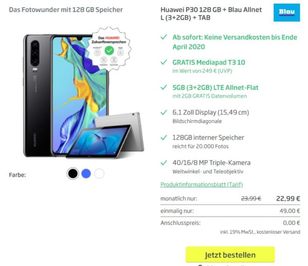 *TIPP* Huawei P30 inkl. Mediapad T3 10 + 5 GB LTE + Allnet-Flat im o2-Netz für 22,99€/Monat – effektiv 1,62€/Monat