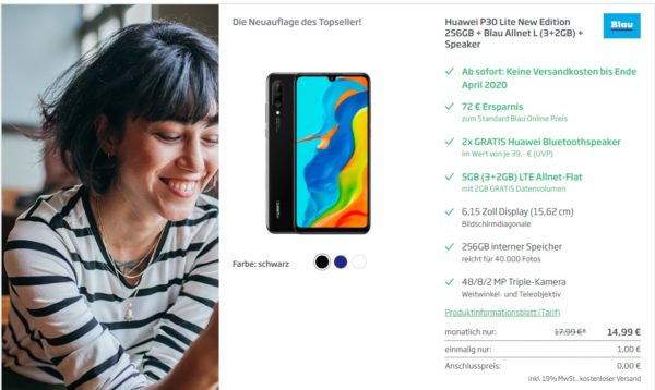 *ENDET HEUTE?* Huawei P30 Lite New Edition inkl. 2x Huawei Bluetoothspeaker inkl. 5 GB + Allnet-Flat für 14,99€/Monat – effektiv 3€/Monat