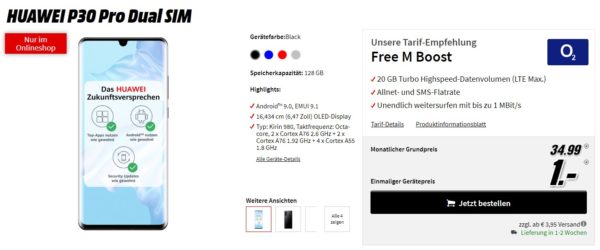 Bei MediaMarkt bekommt ihr gerade das Huawei P30 Pro inkl. o2 Free M Boost (20GB LTE + Allnet-Flat) für 34,99€/Monat