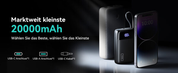 - Mit PD 22,5W Schnellladung: Lädt bspw. das iPhone 15 in 25 Minuten bis zu 65% auf!