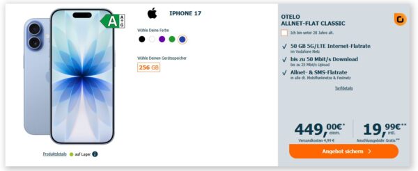 iPhone 17 + Otelo Allnet-Flat Classic (50GB) für 19,99€/Monat – effektiv 3,07€/Monat