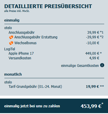 Es fallen einmalig 449€ + Versand an, ihr bekommt aber das iPhone 17 im Wert von ~900€ dazu.