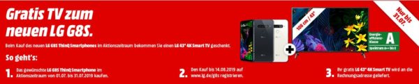 Jetzt haut MediaMarkt einen richtigen Knaller raus, denn ihr bekommt das LG G8s + LG 4K UHD TV + 10GB LTE inkl. Alles-Flat für 26,99€/Monat