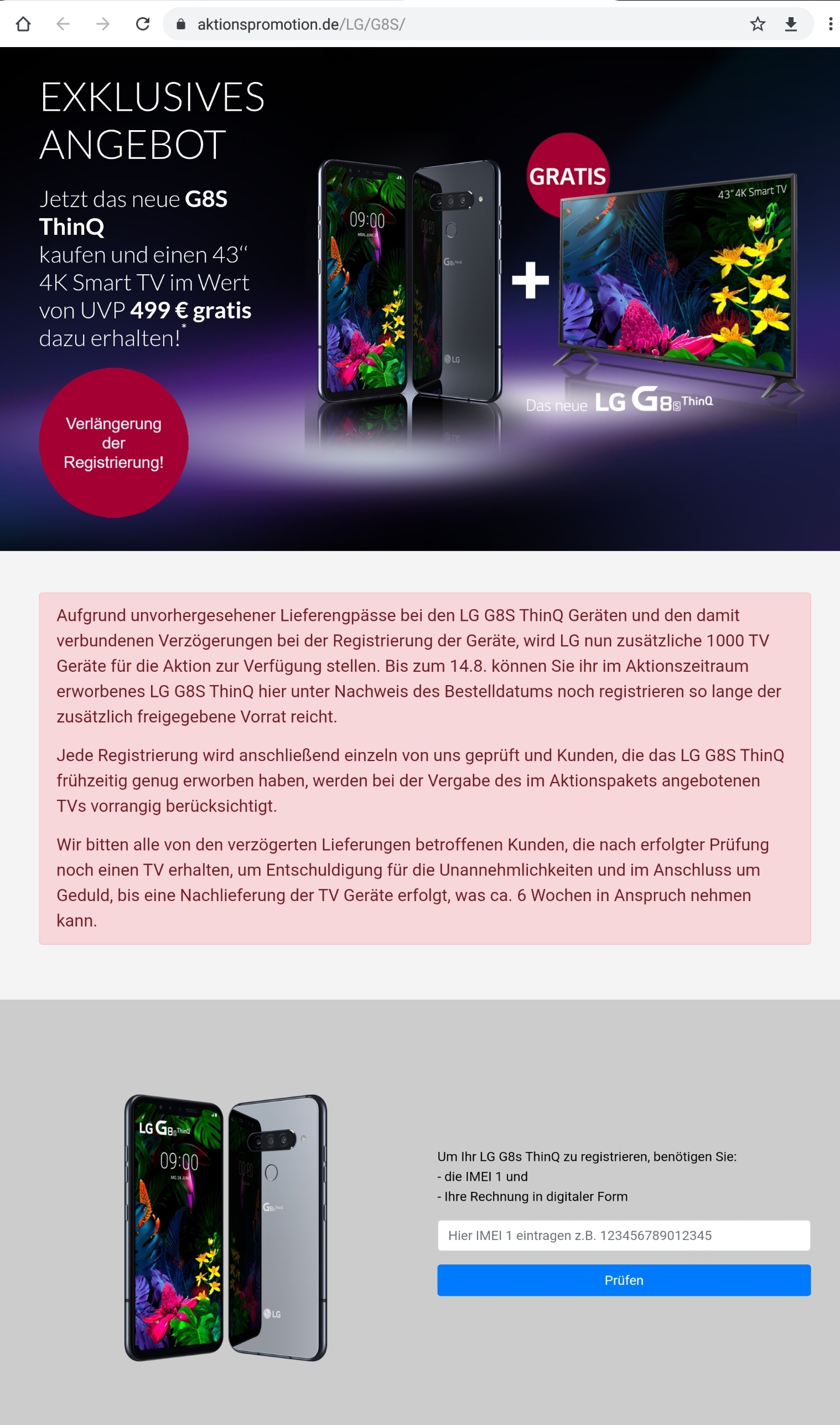 "wir bedauern die aktuelle Situation und entschuldigen uns hiermit bei der Kundschaft für die Verzögerungen bei der Lieferung des LG G8S ThinQ. Der Erfolg der Aktion war unerwartet groß und aufgrund einzelner Betrugsversuche sind wir dazu gezwungen, die eingegangen Bestellungen noch sorgfältiger individuell zu überprüfen. Wir werden unserer Auftragsverpflichtung in den jeweiligen Vertriebskanälen bis 31.7.2019 nachkommen, sodass alle Bestellungsrückstände bis Ende der ersten Augustwoche wieder eingeholt worden sind. Alle Kunden, die das LG G8S ThinQ frühzeitig erworben haben, werden den im Aktionspaket angebotenen TV noch erhalten."